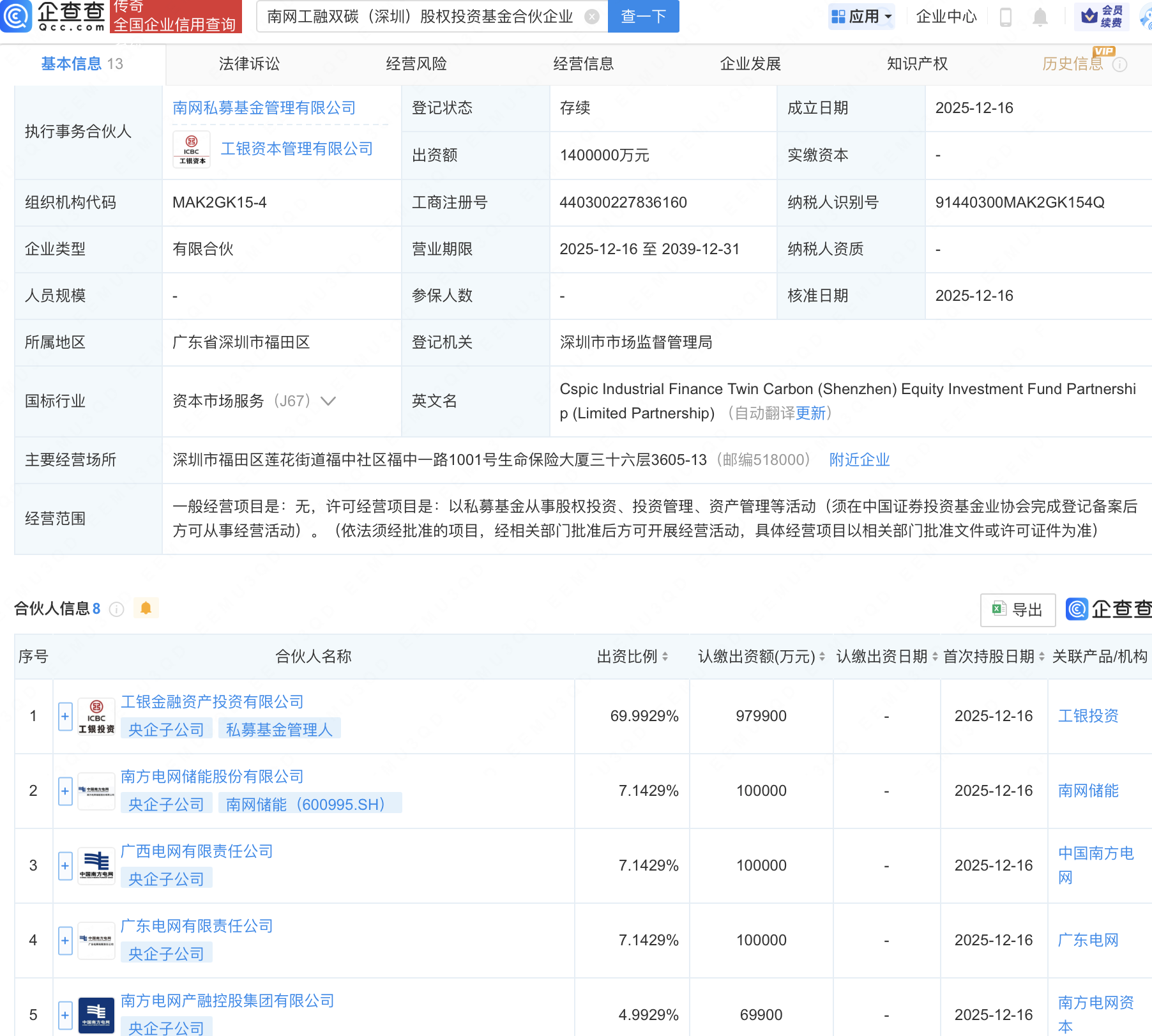 近日,南网工融双碳(深圳)股权投资基金合伙企业(有限合伙)成立,出资额140亿元,经营范围包含:以私募基金从事股权投资、投资管理、资产管理等活动。企查查股权穿透显示,该企业由工银金融资产投资有限公司、南网储能(600995)等共同出资。