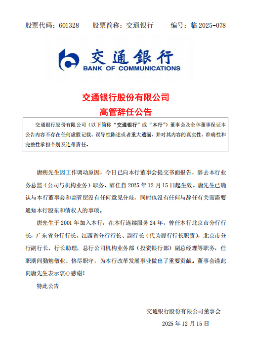 12月15日,交通银行发布高管辞任公告,唐朔先生因工作调动原因,向公司董事会提交书面辞呈,辞去业务总监(公司与机构业务)职务。资料显示,唐朔先生于2001年加入交通银行,累计服务24年,任职期间履历丰富,曾担任北京市分行行长、广东省分行行长、江西省分行行长(含代为履行行长职责)、总行公司机构业务部(投资银行部)副总经理等多个重要职务。
